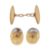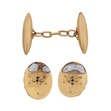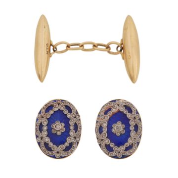 The plaques of oval design, set with rose-cut diamonds on blue enamel guilloché decorations, bicolour metal unmarked and untested, length 1.8cm, together with a double-sided barrel-shaped single cufflink, chain link connectors, mounted in 18ct yellow gold, UK hallmark, termination length 2.2cm; total gross weight 8.4grs (2)