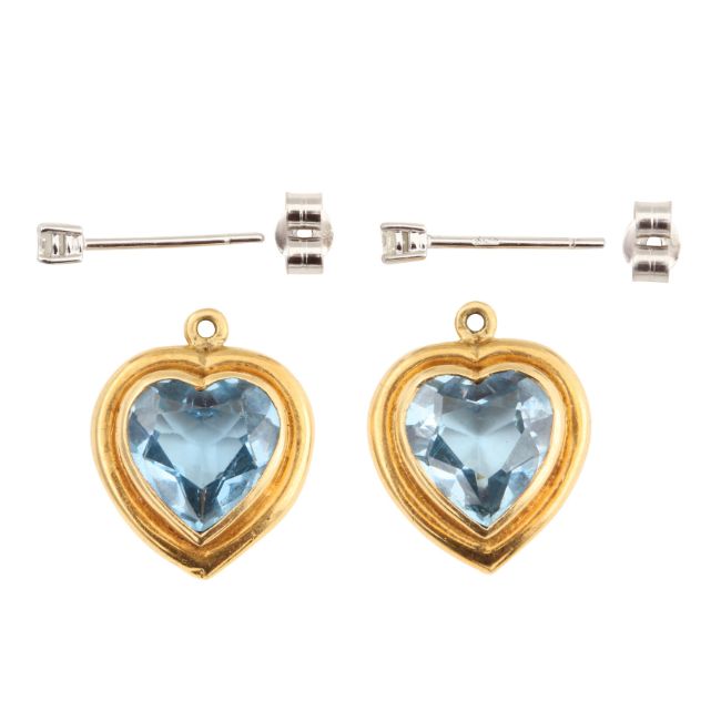 Each collet-set heart-shaped synthetic spinels, to a brilliant-cut diamond surmount, mounted in 18 carat white and yellow gold, post fittings, partial UK hallmark, length 1.8cm, weight 5.1grs