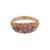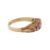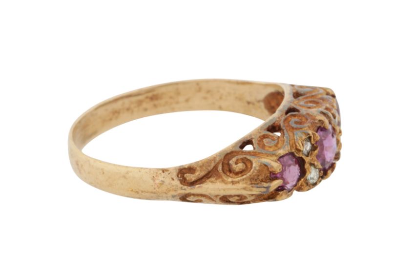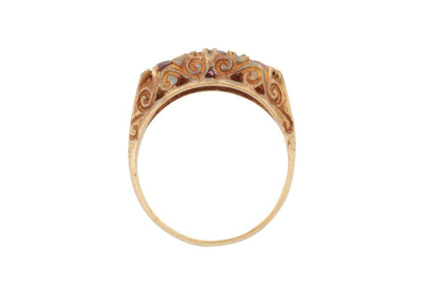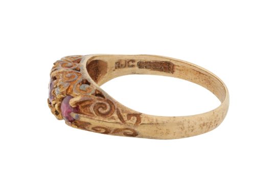 Set with circular-cut rubies, accented by single-cut diamonds, to a scroll decorated gallery, set in 9ct yellow gold, maker's mark, UK hallmark, size O, weight 2.8grs