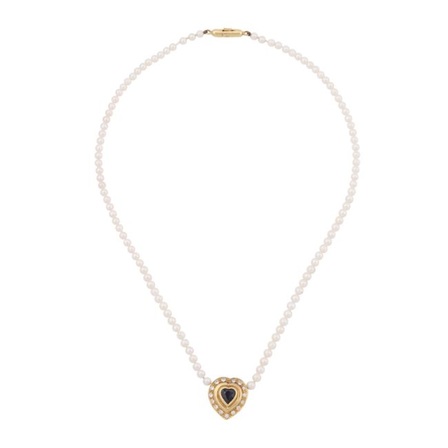 The single-strand cultured pearl necklace, suspending a heart-shaped pendant set with a collet-set heart-shaped sapphire within a frame of brilliant-cut diamonds, push clasp stamped 750, lengths: pendant 1.6cm, chain 38.0cm