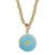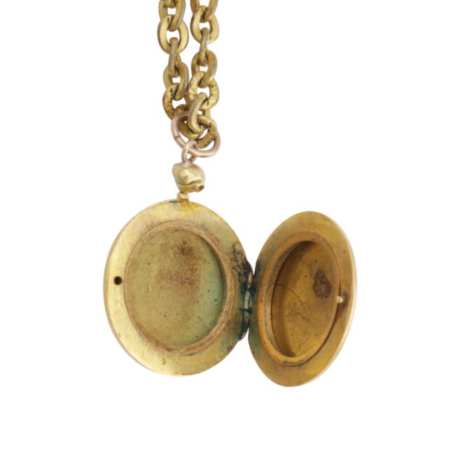 The cable-link chain necklace, suspending a locket pendant of circular design, decorated on the front with light blue enamel, mounted in yellow metal, pendant stamped 18K, chain gold plated, lengths: pendant 2.9cm, chain 104.0cm, approximate pendant weight 10.0grs, total gross weight 41.2grs
