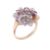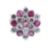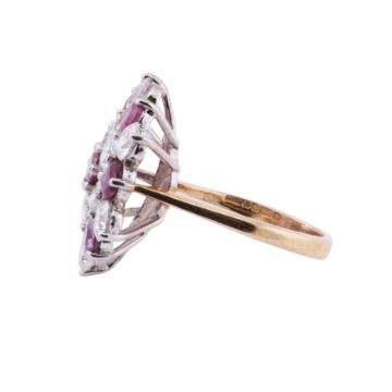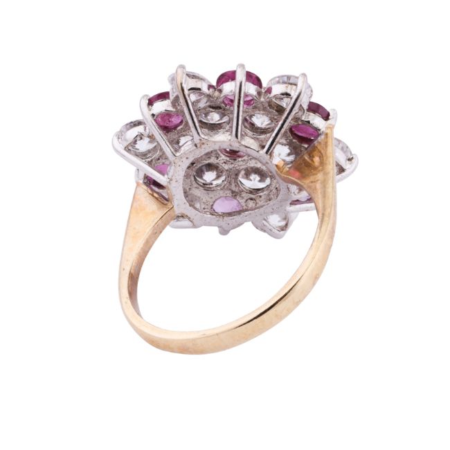 The flowerhead set with circular-cut diamond imitations and rubies, to a 9ct yellow and white gold mount, maker's mark, UK hallmark, size P½, weight 6.5grs