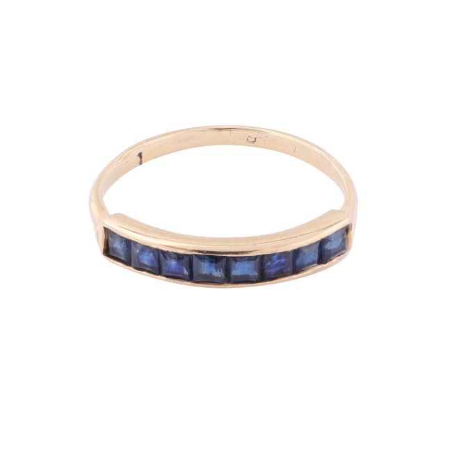 Set with square step-cut sapphires, to a yellow mount, indistinct marks, ring size J½, weight 1.2grs