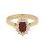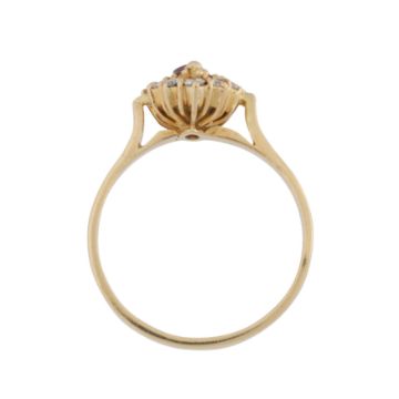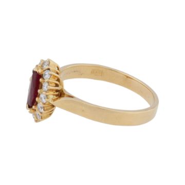 Of lozenge design, claw-set with a marquise-cut ruby, surrounded by brilliant-cut diamonds, pointed shoulders, mounted in yellow metal, stamped 18Ct, size P, weight 4.8grs