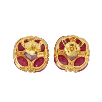 Each centrally set with a sqaure-cut amethyst, surrounded by oval-cut rubies, post and butterfly fittings, mounted in yellow metal, stamped 925, length 1.5cm, weight 5.0grs