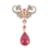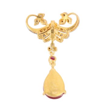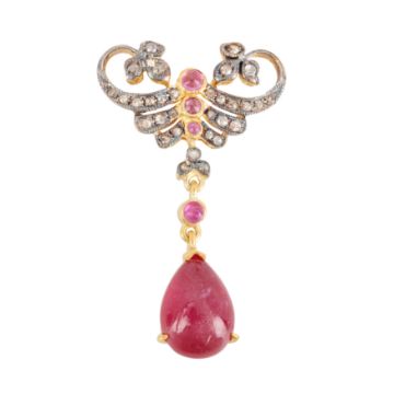 Of drop and scroll design, set with ruby cabochons and rose-cut diamonds, mounted in bicolour metal, stamped 585 and 925, length 3.5cm, weight 3.0grs