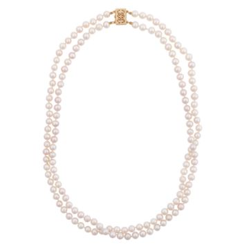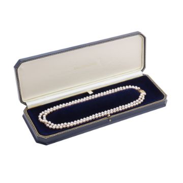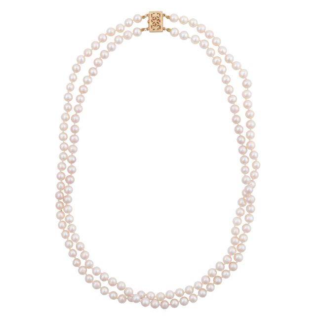 The two strands of 5.0-5.5mm cultured pearls of white bodycolour and pink overtone, to a pierced rectangular clasp stamped 14K, length of shortest strand 45.0cm, to a goldsmiths box