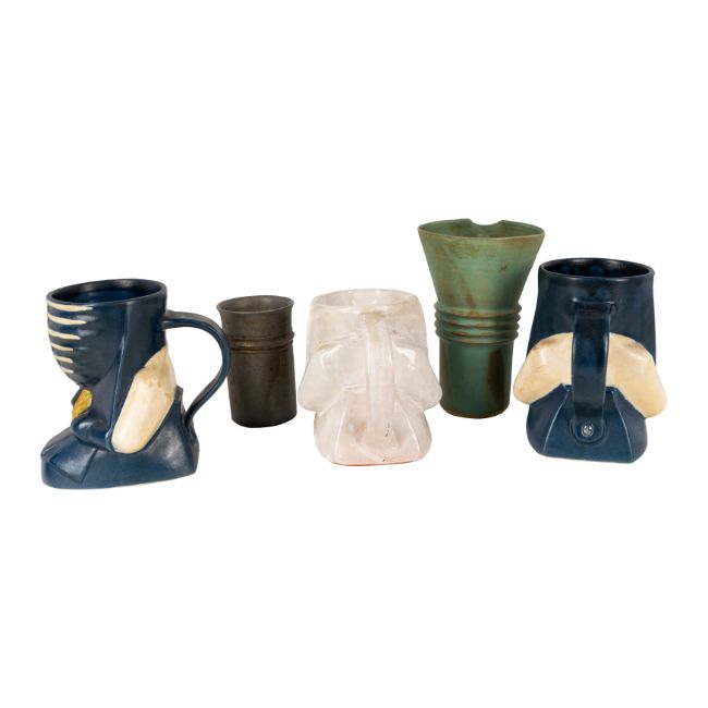 Two Ray Marshall scroll handled cups in stoneware with sgraffito manganese glaze, 8cm high, two pieces of glazed stoneware pottery in the Japanese taste, and three limited edition Kendo World Championship Toby jug awards dated 1976, two blue 15.2cm high and one white, painted and impressed marks.